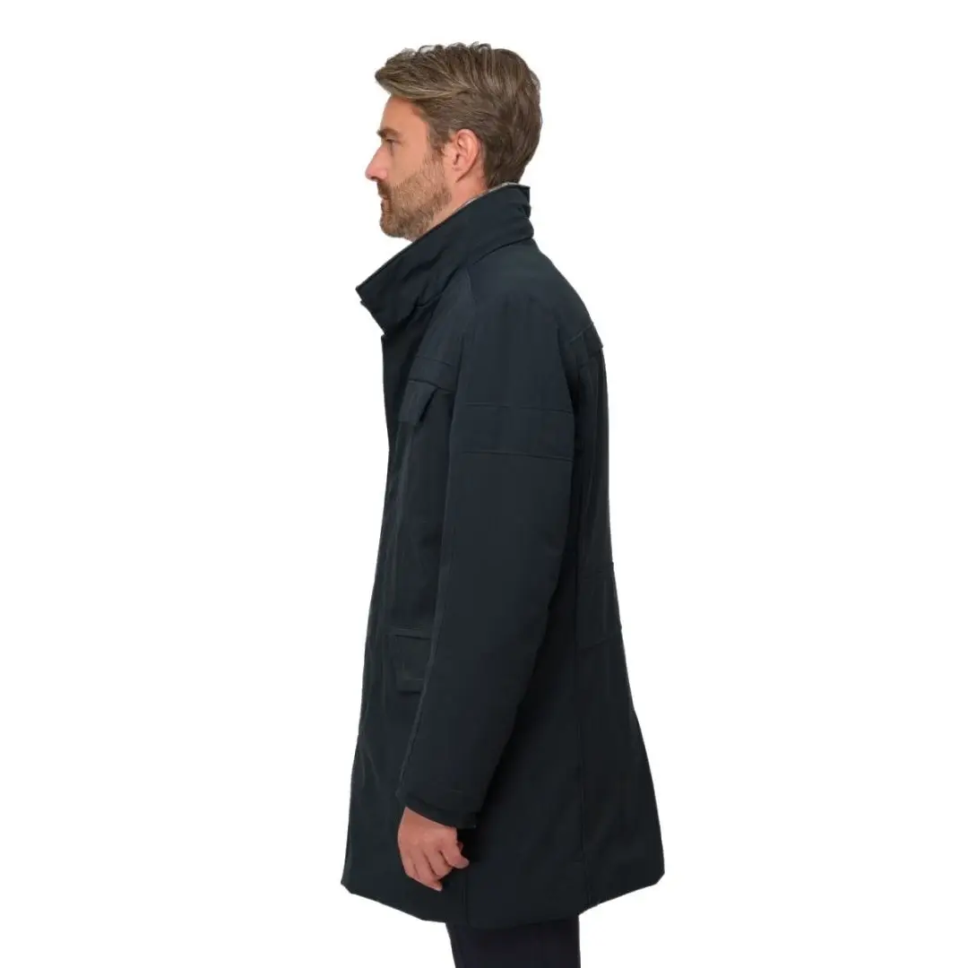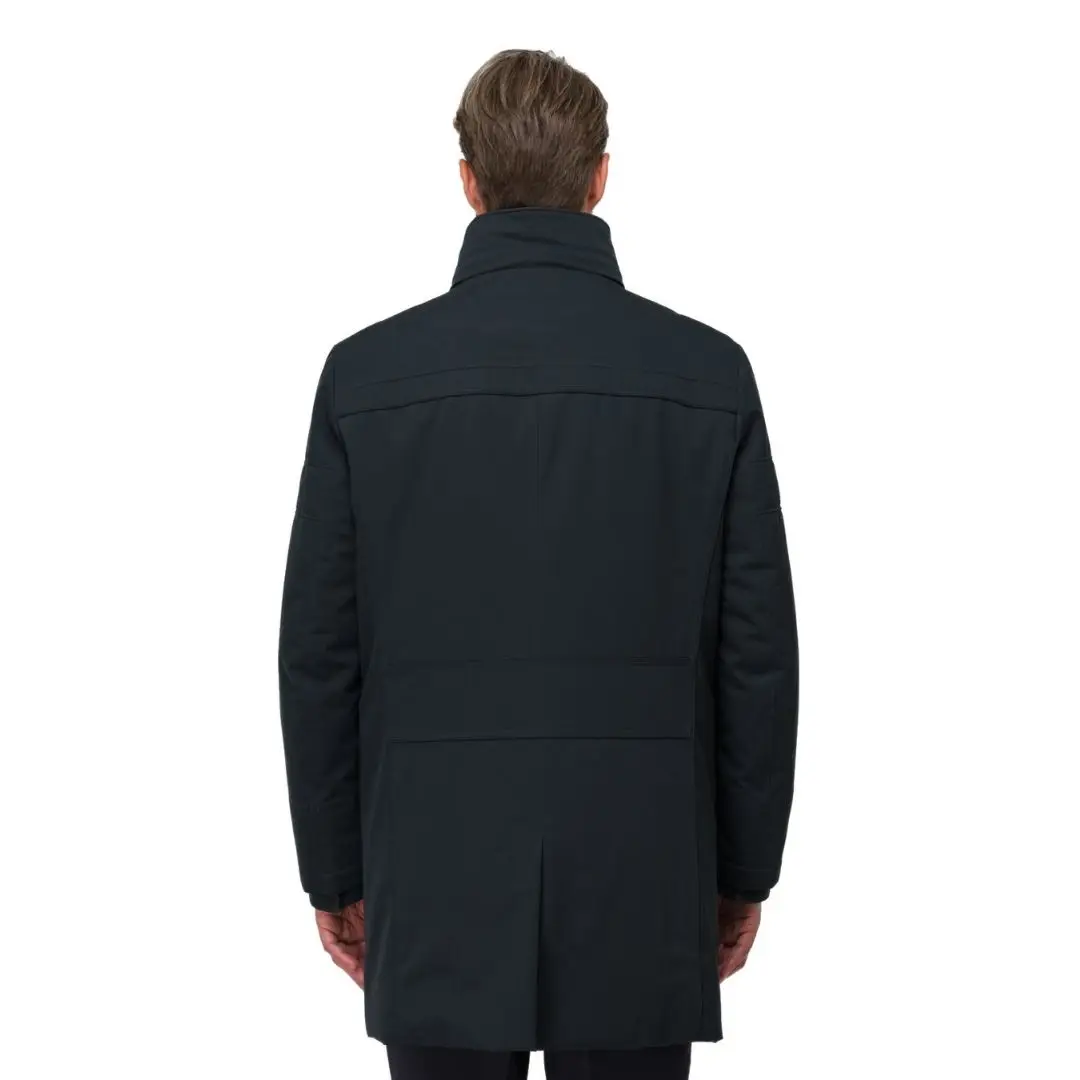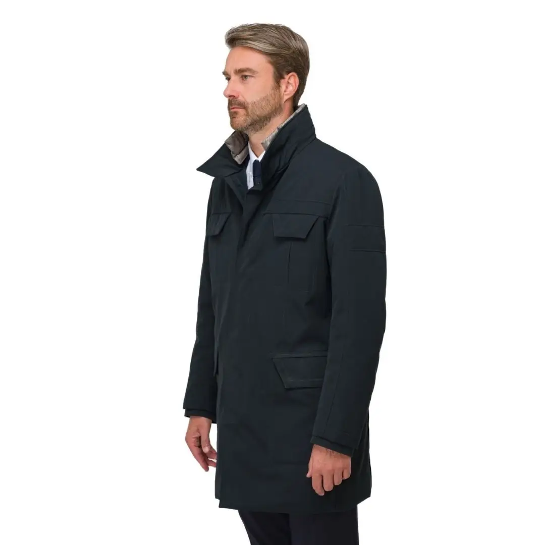 the high collar, ideal for protecting yourself from wind and bad weather, the practical and discreet hidden zip closure, the standard top and bottom pockets with geometric lines which characterise an otherwise extremely linear garment, as can be seen from the choice of the practical and inconspicuous double cuff. The wide martingale and the double seam of the yoke also give character to the back of the garment which sports a gold-coloured inner lining that helps to embellish the whole.