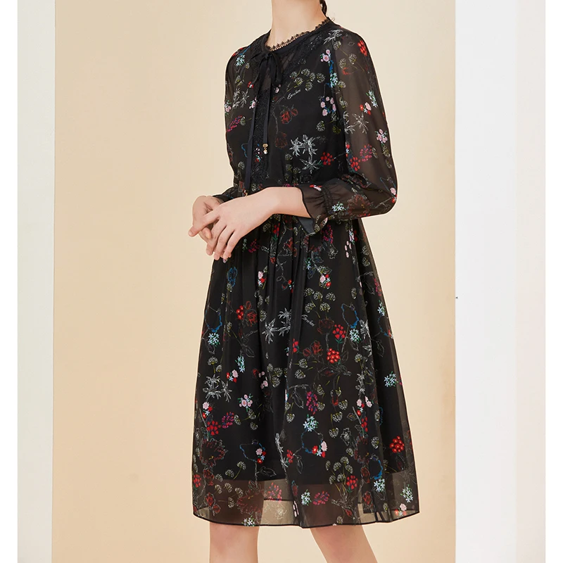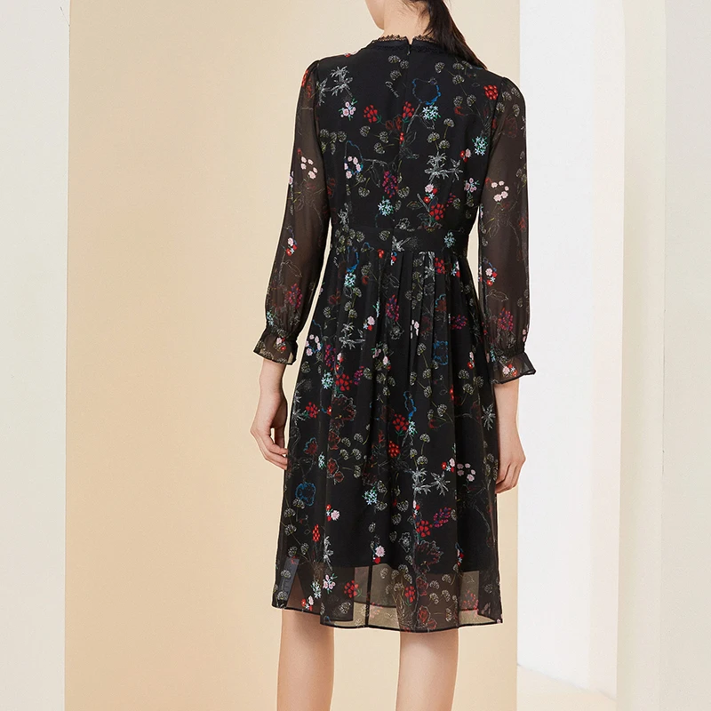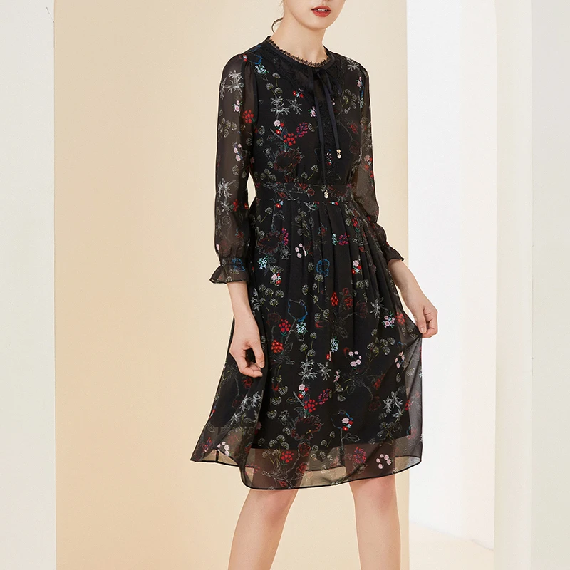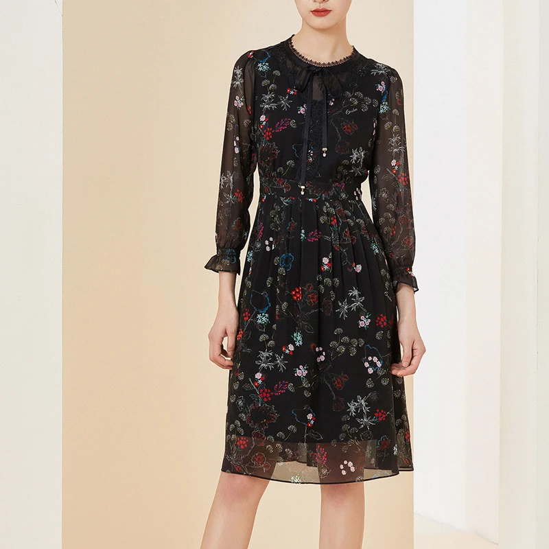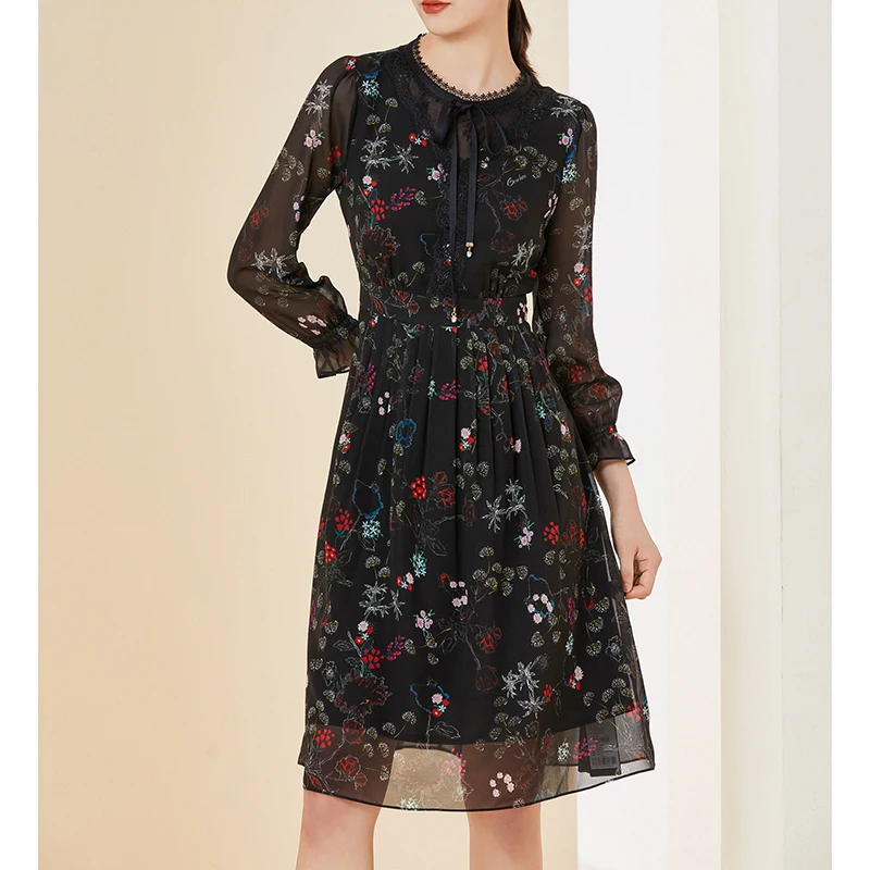 Floral printed lace neck bow sheer long sleeve ruffle cuff banded waist pleated A-line dress